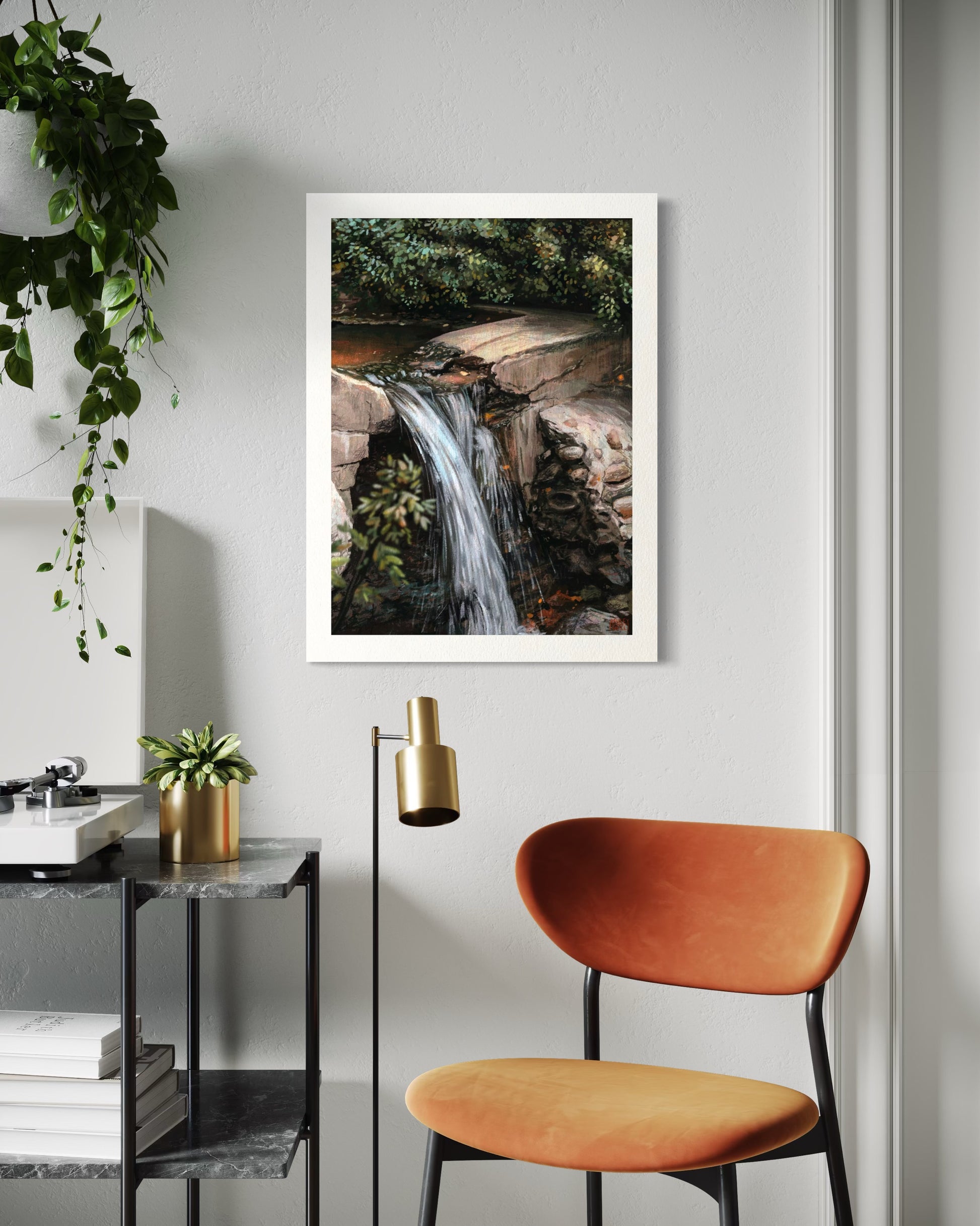 The Fall, now available as a fine art print. This digital painting highlights the beauty found in the rubble. Capturing the soft flow of the water over a forgotten build.