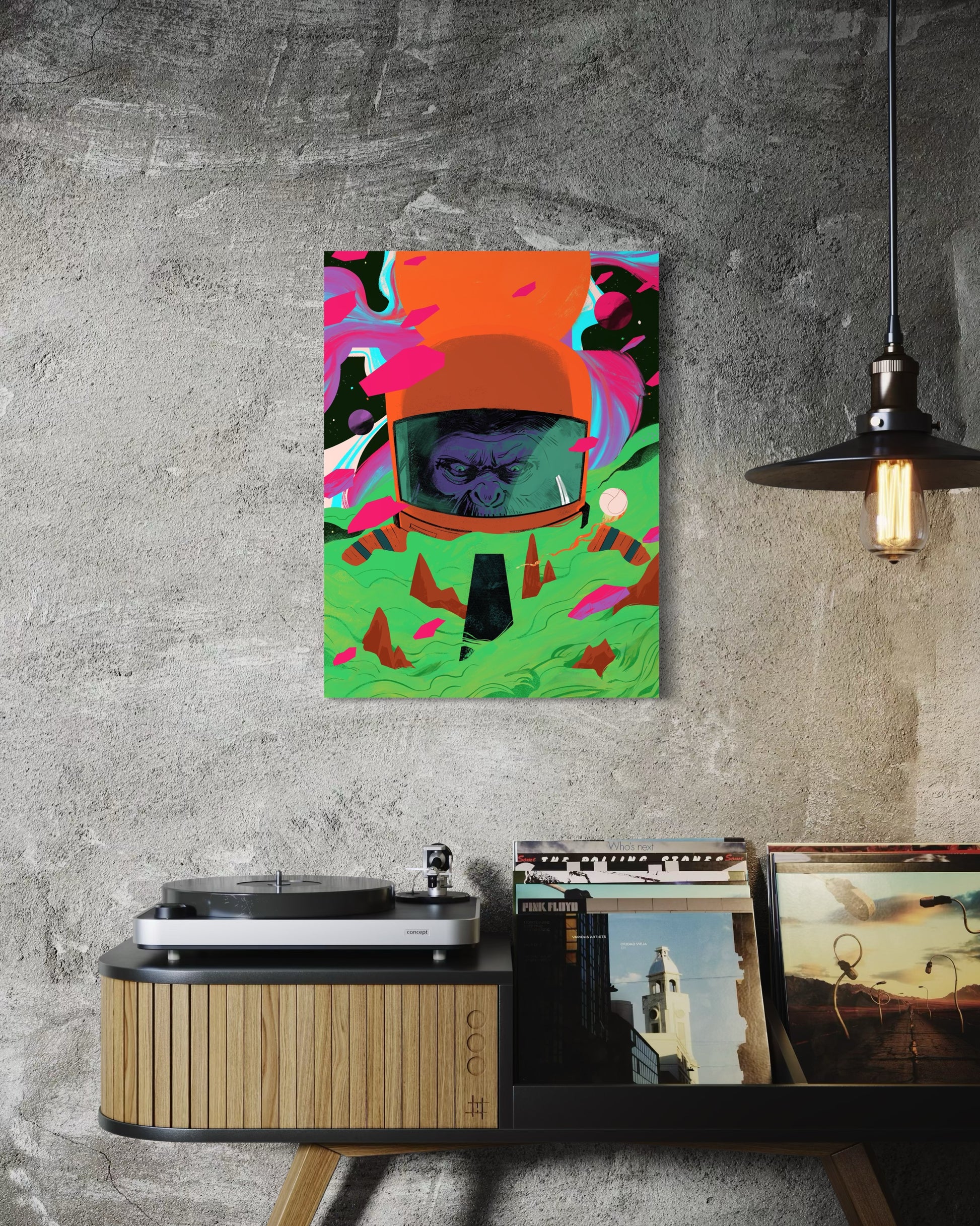 A meeting point between 2001: A Space Odyssey and Planet of the Apes. Humanity gives way to the primate, exploring the infinite. This beautiful art is available as fine art prints.