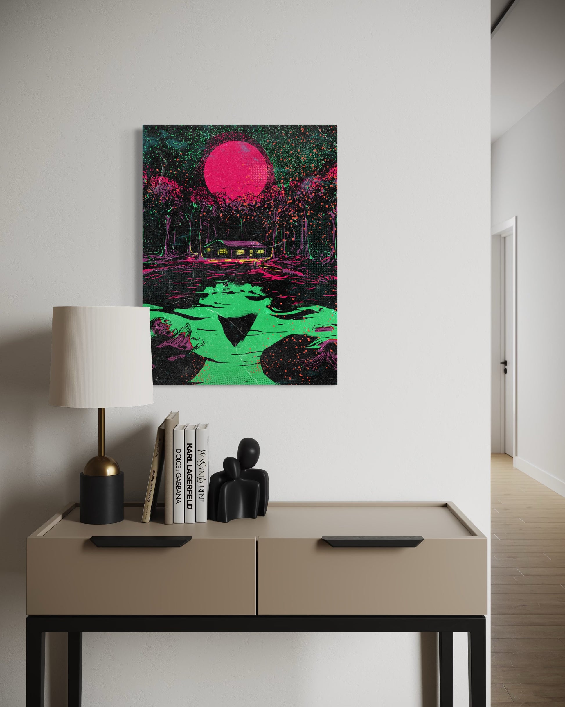 Driven by a synthwave soundtrack, this illustration draws inspiration from classic 80s horror films. This beautiful art is available as fine art prints.