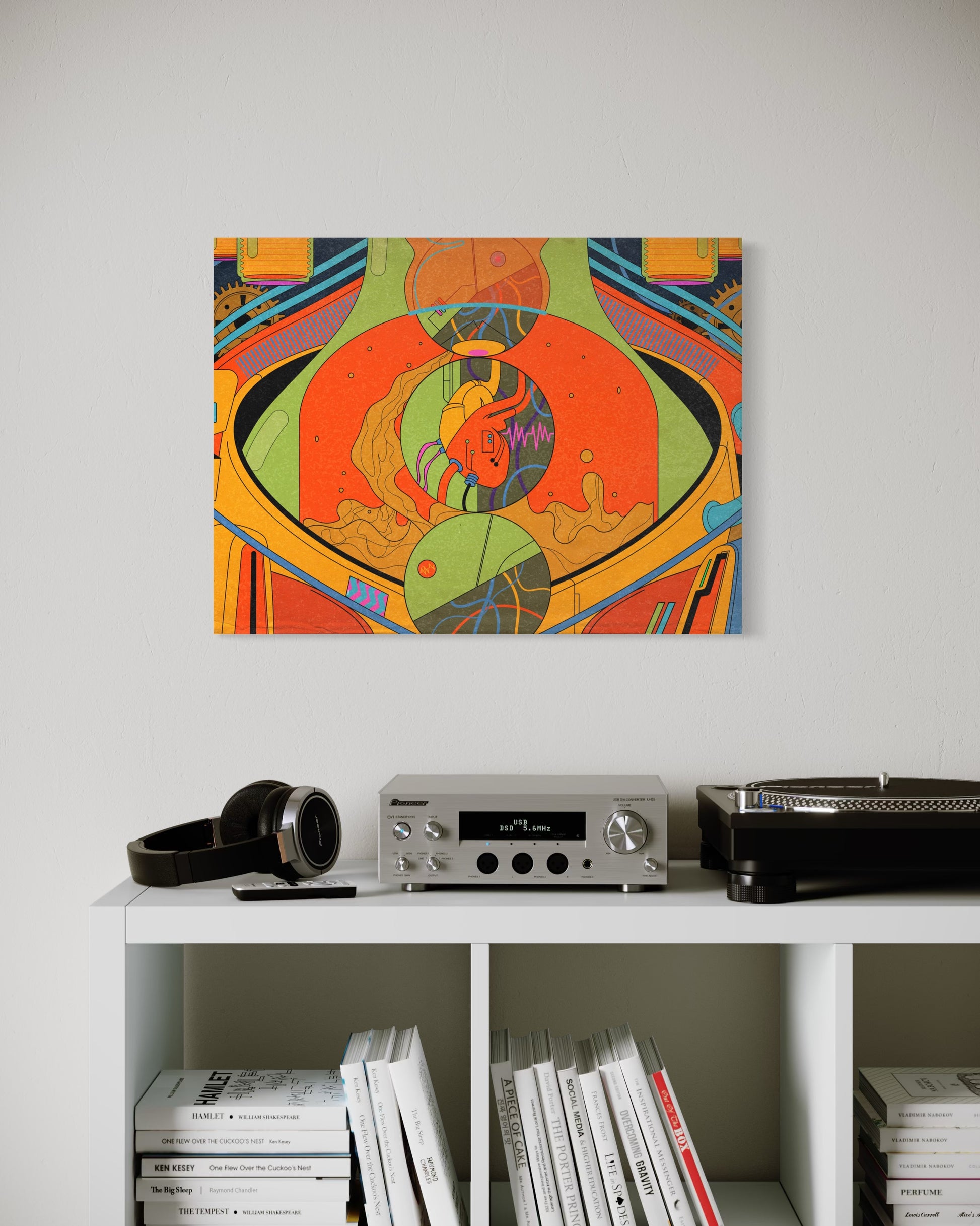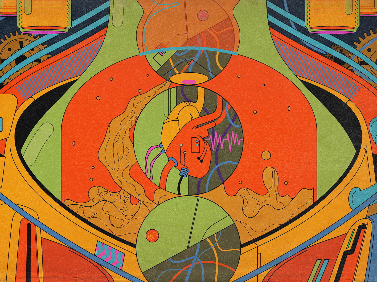 This illustration symbolizes human resilience amid machines and algorithmic logic. A heart beats among cables and gears, giving meaning to the machine. This beautiful art is available as fine art prints.