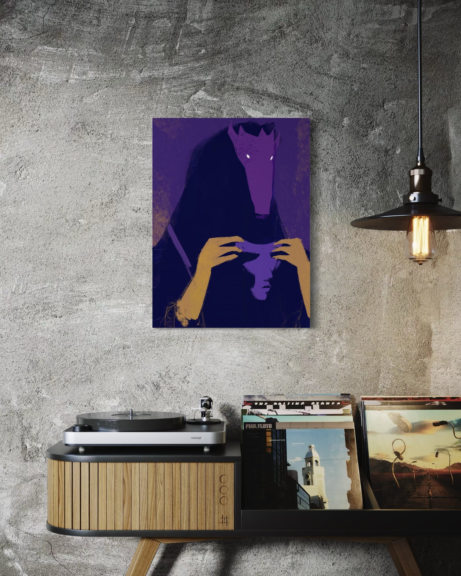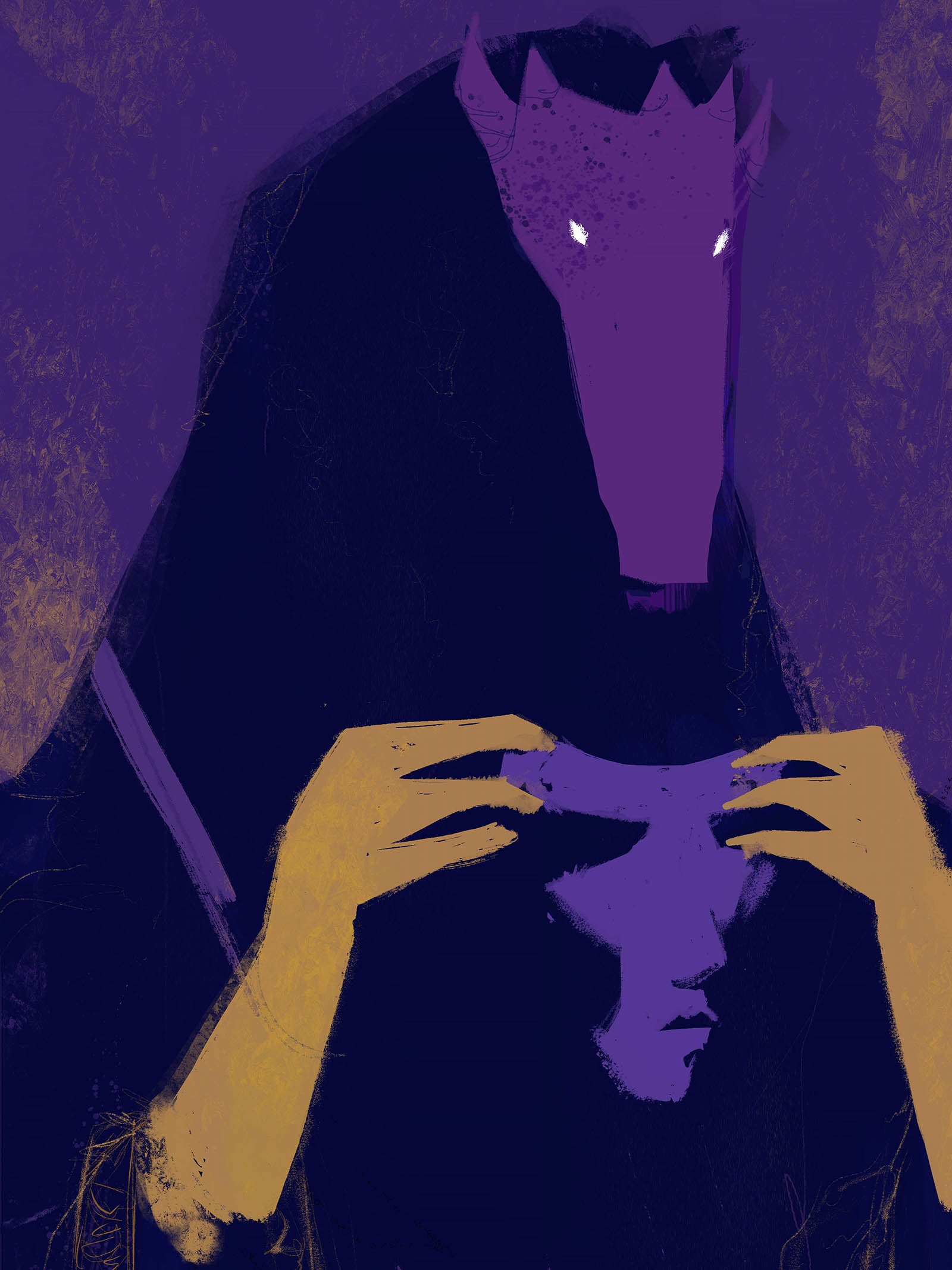 A reflection on humanity. A creature holds a mask with human features. Who is the monster? This beautiful art is available as fine art prints.
