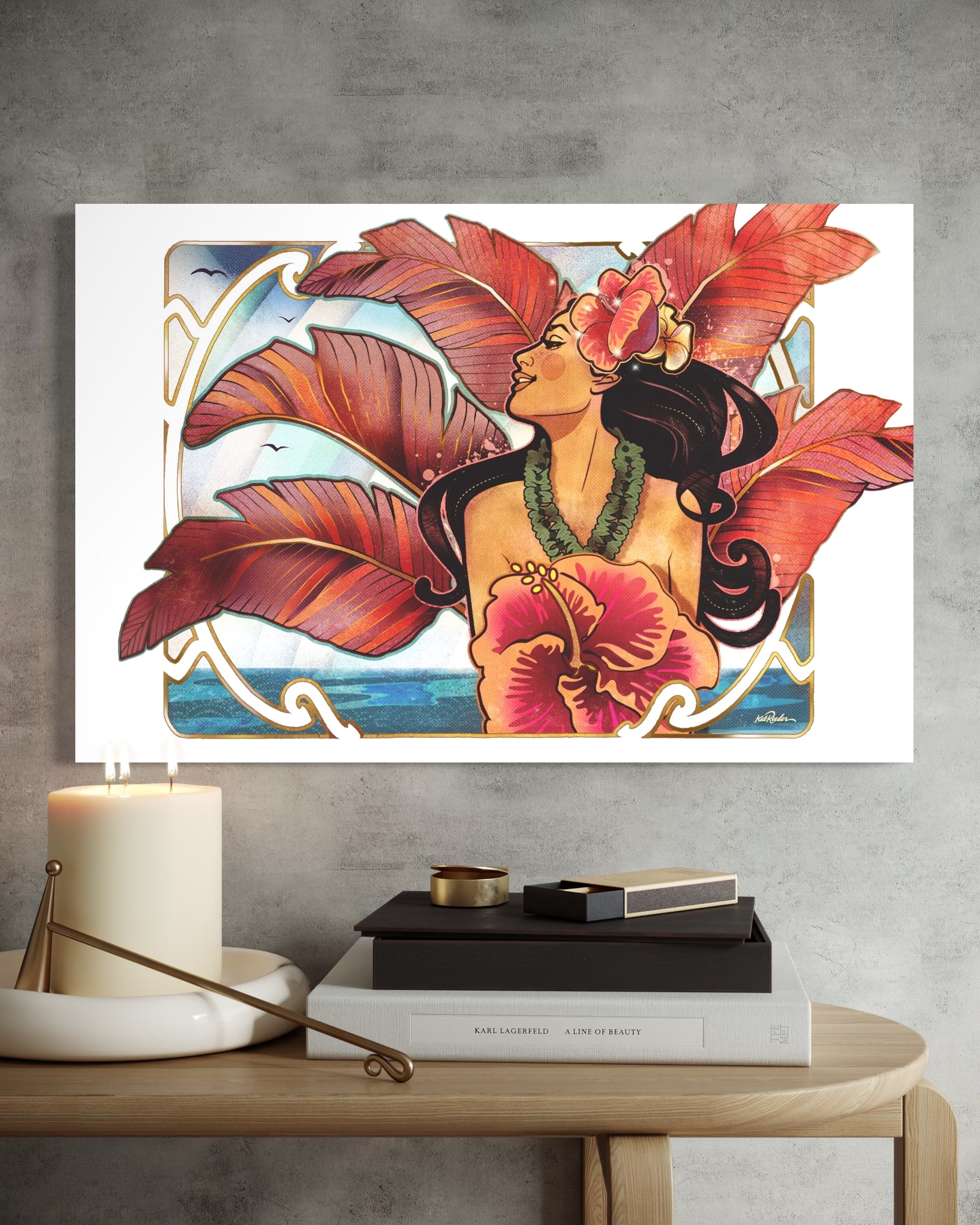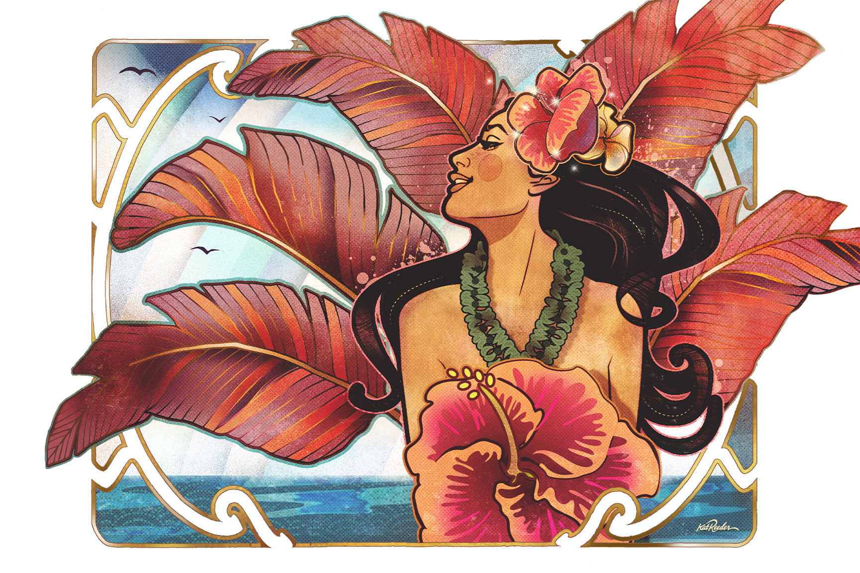 This striking art nouveau portrait of a Hawaiian woman against sweeping red palm leaves is a tribute to island elegance. With hibiscus in her hair and ocean behind, she radiates classic tropical beauty.