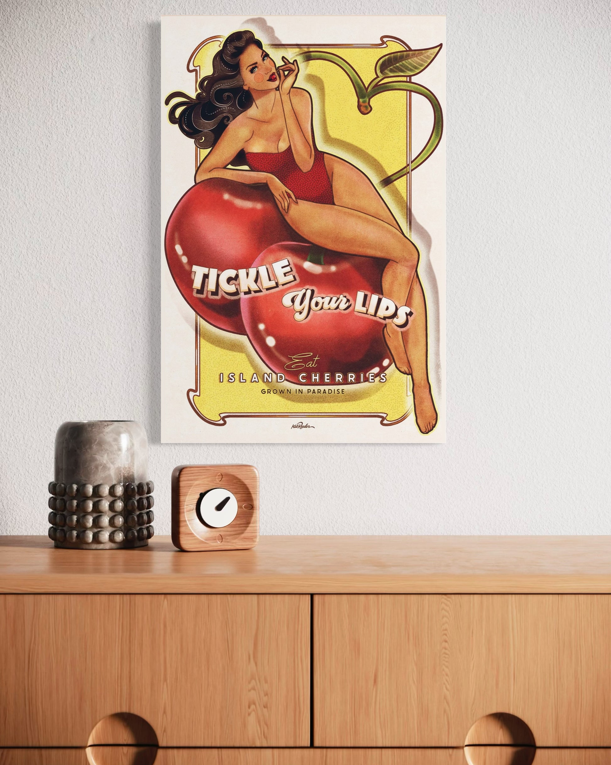 Dripping with vintage seduction, this cherry-themed pin-up poster captures the vibe of classic advertising and classic American Pinup. Perfect for collectors of vintage posters, tropical decor and classic Americana
