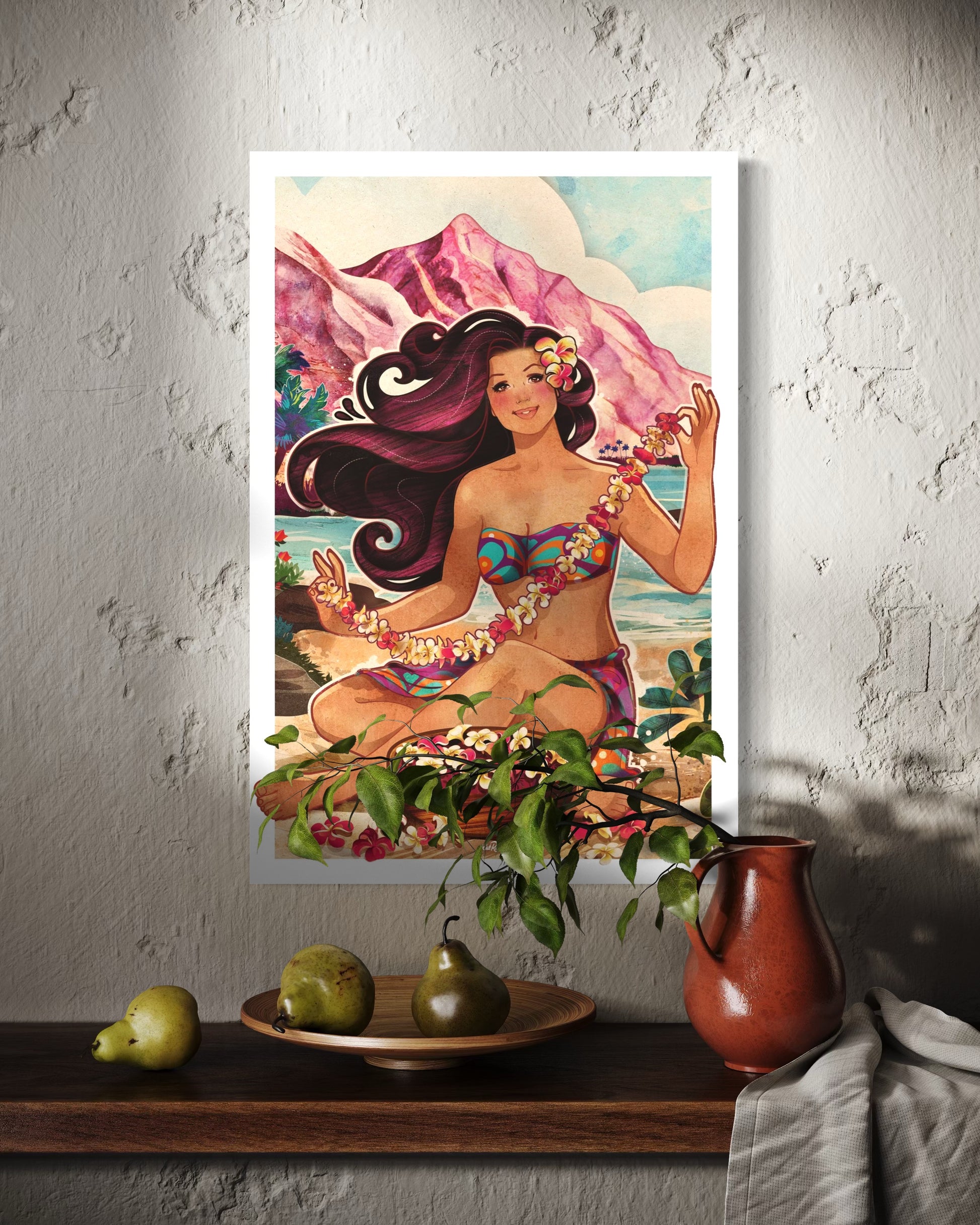Inspired by the joy and spirit of old Hawaii with this vibrant print of a lei-making island girl. With fantasy paradise in the background, this cheerful and colorful artwork exudes a classic retro charm and feminine allure.
