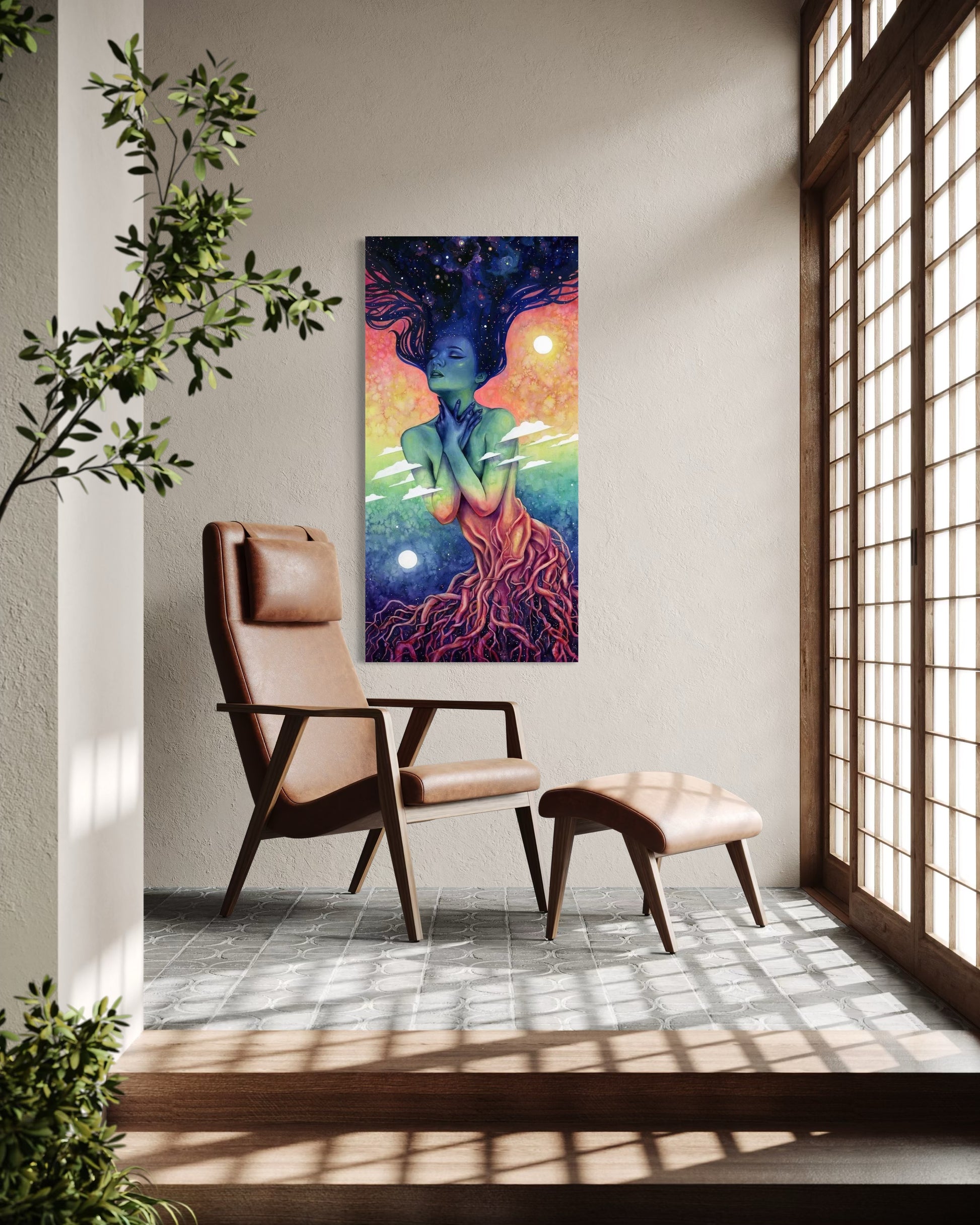 "Liminal" was created in 2018 as a part of Kelly’s “Anamnesis” series for Arch Enemy Arts. The original painting was created with watercolor, acrylic, and acryla gouache, now available as a fine art print. The original has sold.