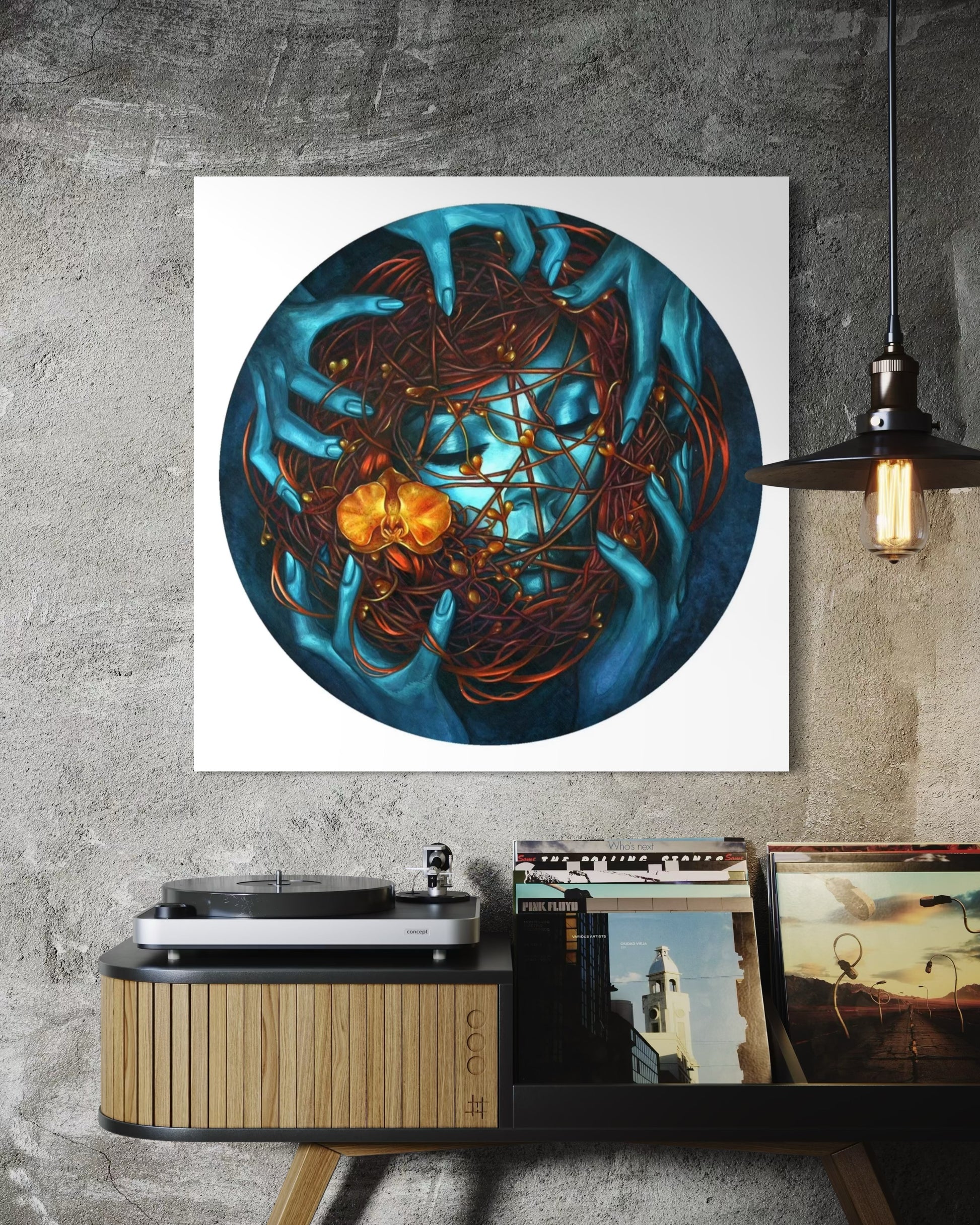 “Quietus” was painted in 2018 with watercolor and acryla gouache and measured 16” x 16”, now available as a fine art print. The original has sold.